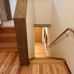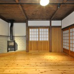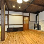 薪ストーブのある居間、接客もできる広い土間。冬暖かく夏は涼しくという家づくりの基本を大切にした住まいは、小国の杉を始め、無垢材をふんだんに使い、木の香り豊かな空間になりました。