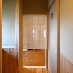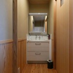 洗面脱衣室を経由してお風呂やトイレに行くのが不便というお悩みから、脱衣室とトイレの間に洗面台を設けた廊下のある間取りへと大きく変更しました。