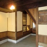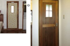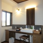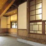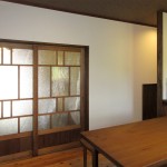玄関から続く逞しい梁の見える土間は、古い建具を生かし、腰壁の上はスペイン漆喰仕上げとし、古民家テイスト溢れる空間になりました。