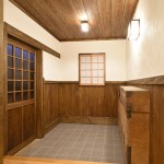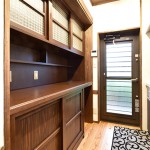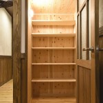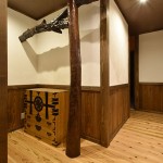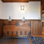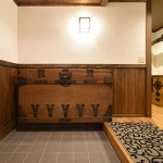 玄関には、この家に古くからある長持をカットして壁に取付けました。また、古い床柱や落とし掛けを再利用して、玄関ホールにデザインとして配置しました。